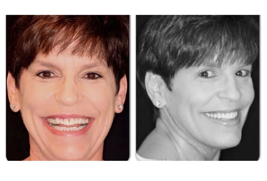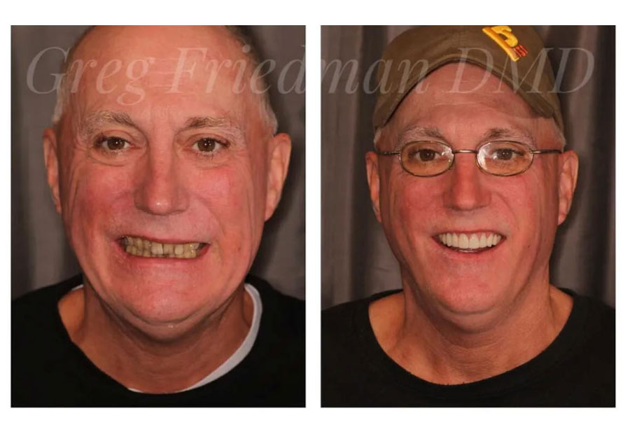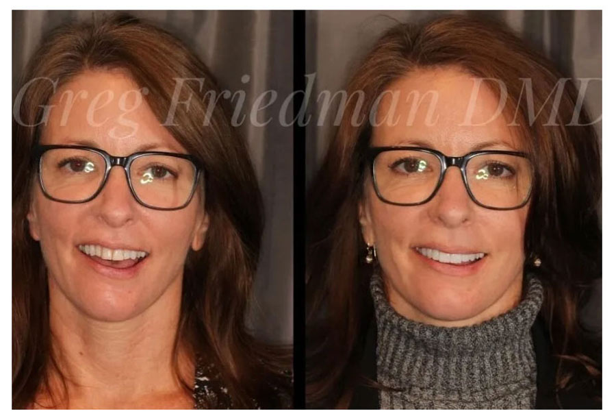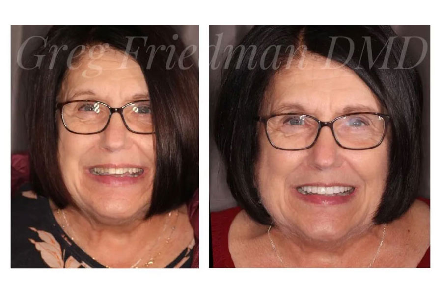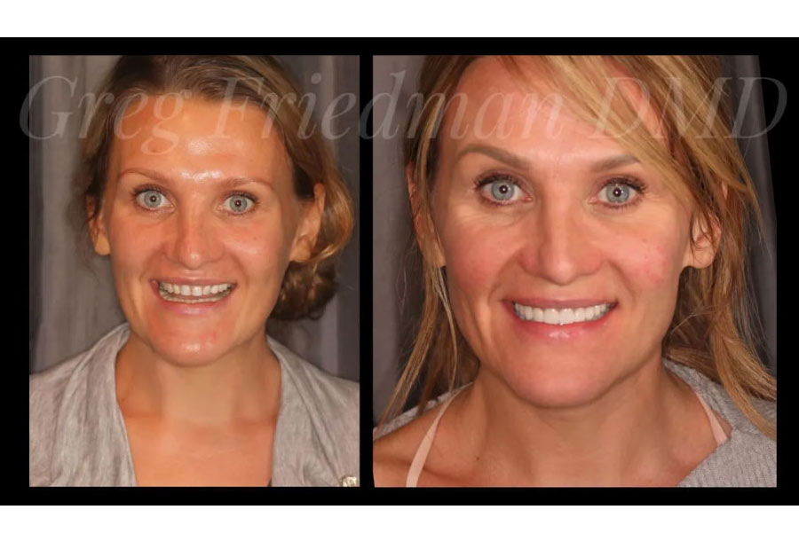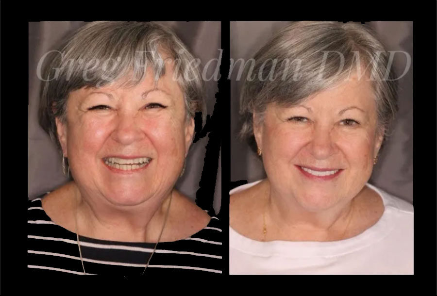 This patient wanted a brighter more youthful smile. Dr. Gregory Friedman placed a combination of 8 upper crowns and 6 lower veneers for a beautiful, young-looking result!