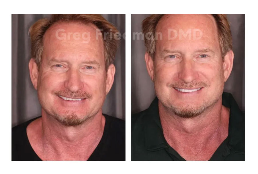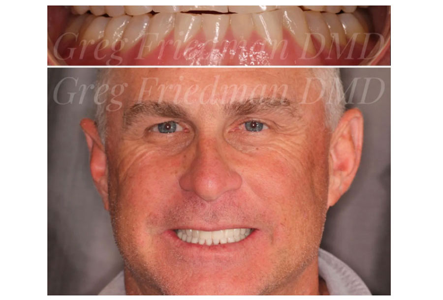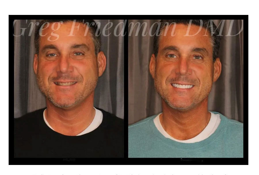 Go Padres! (If you know, you know!) Dr. Friedman had the pleasure of restoring this smile with upper 12 & lower 12 porcelain restorations. This restorative dentistry patient had a collapsed bite from wear over the years bringing his nose & chin closer together. Opening his bite to proper alignment changed his profile to ideal placement for improved smile & face.