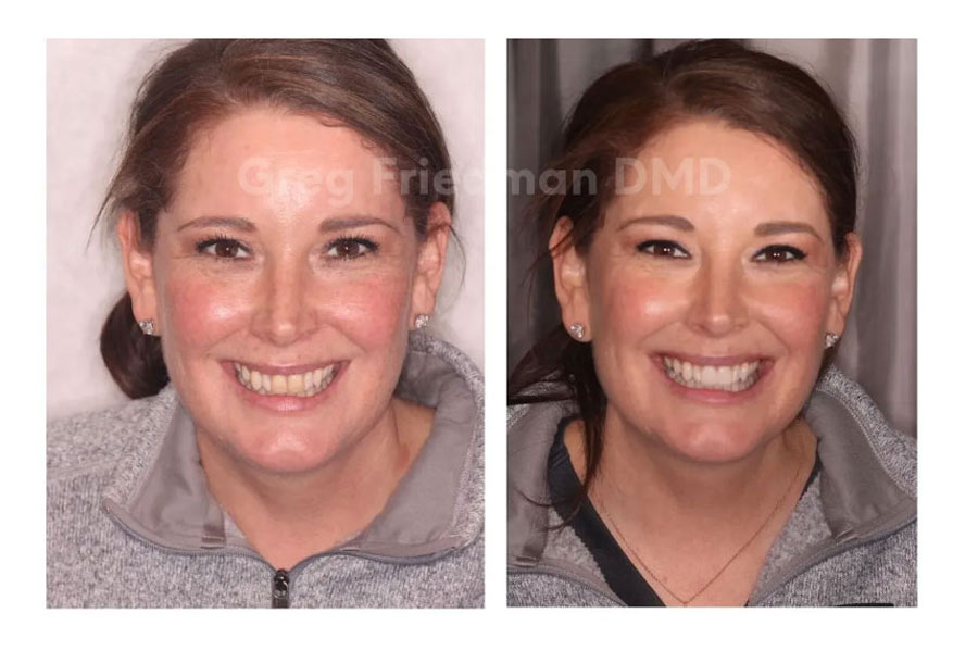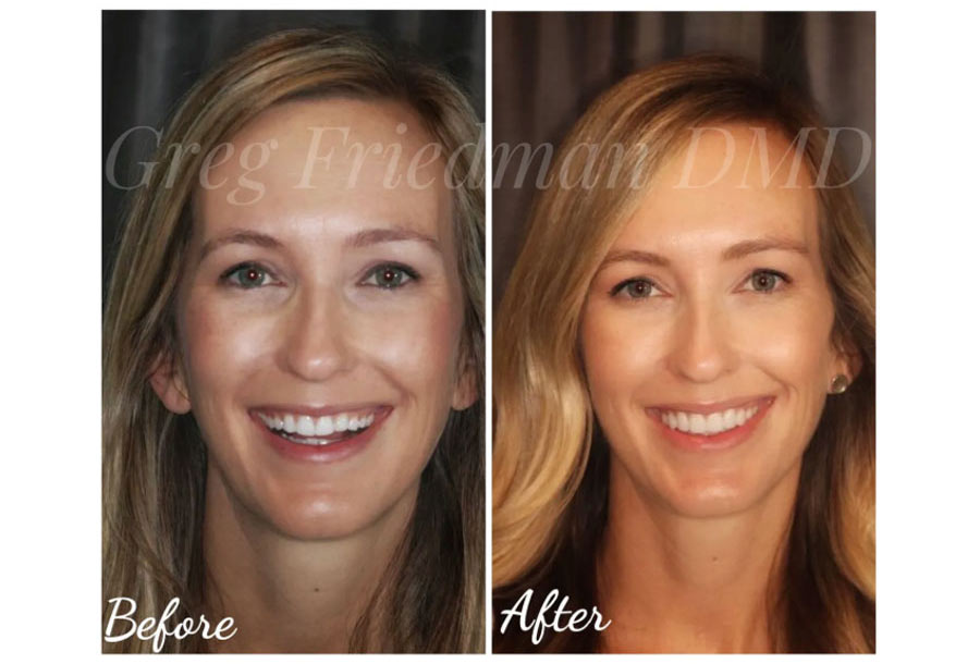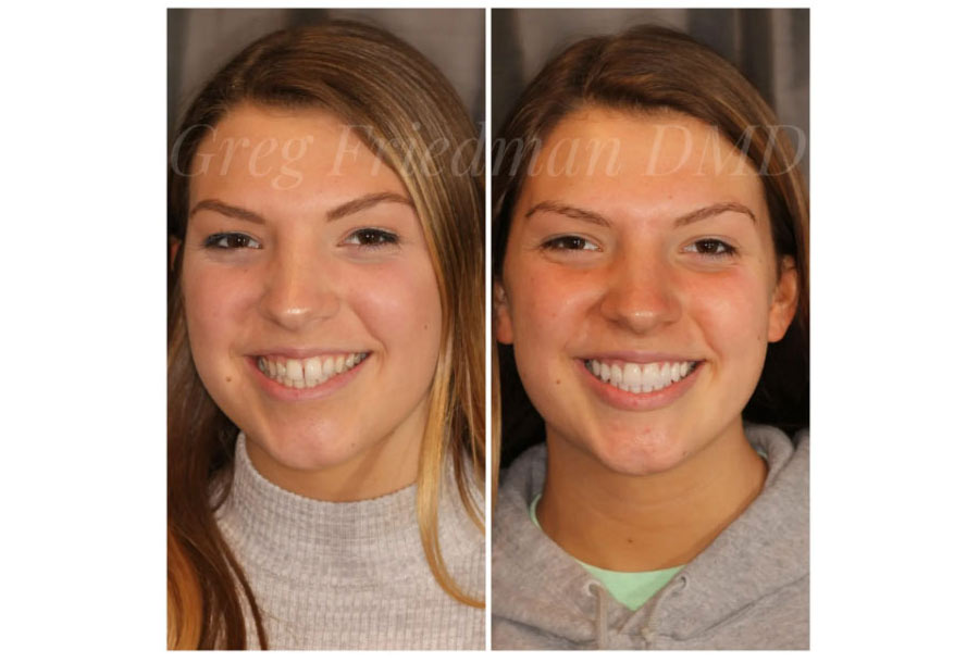 This patient wanted a brighter, more even smile. She also wanted to “show more teeth” with she smiled. After discussing her options for treatment, she had teeth whitening with our Zoom in-office whitening procedure. Then, Dr. Greg Friedman placed 8 upper porcelain veneers for a very natural and beautiful result.